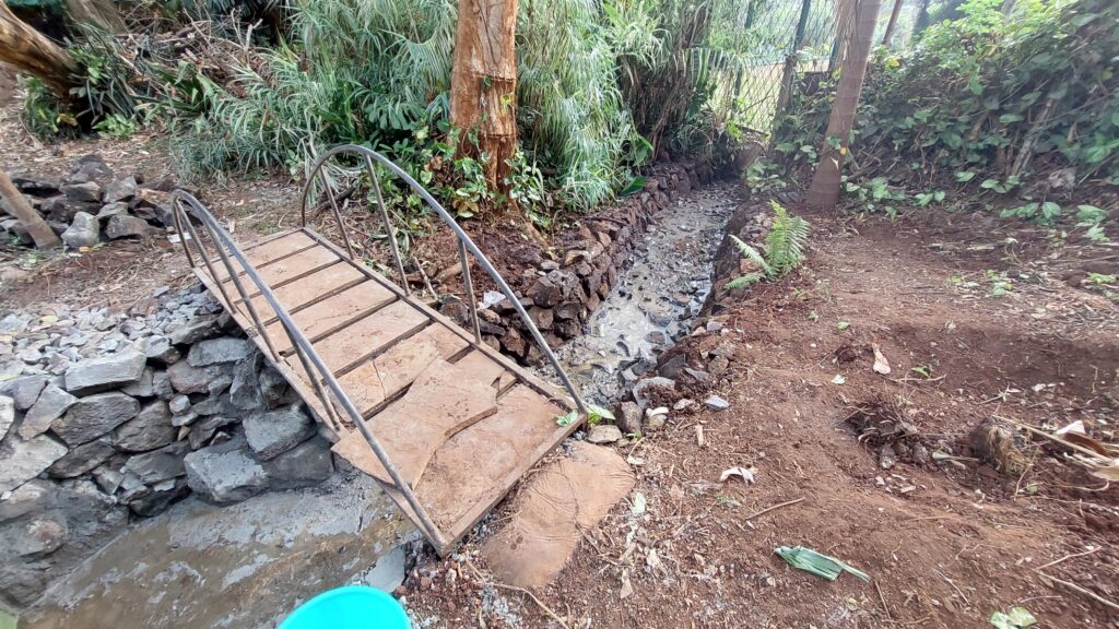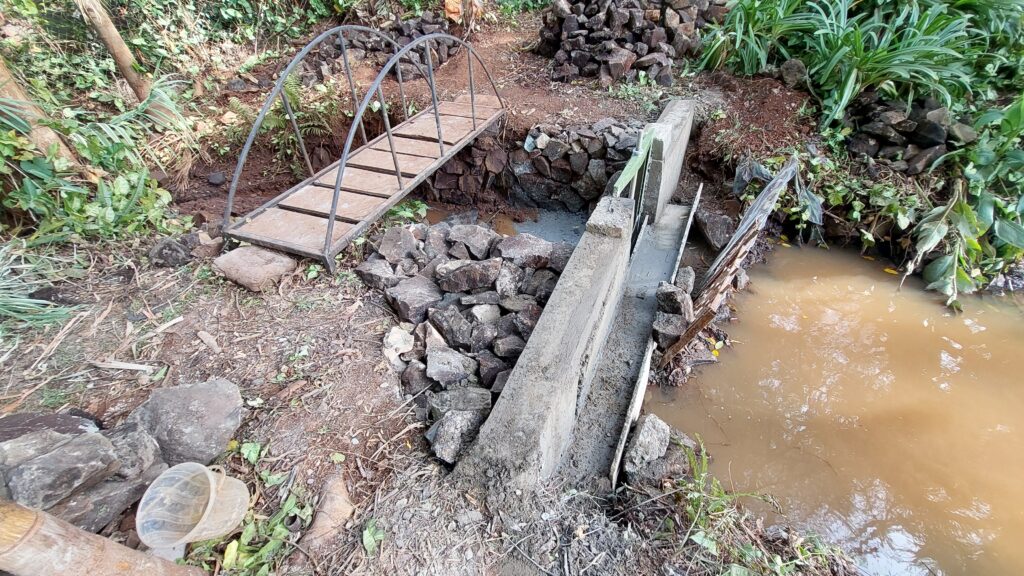 We have cleaned up the outlet river base (to bedrock) and the side walls (pitched blue stone) to speed up flow to Amin Premji's boundary with us (see pictures below).