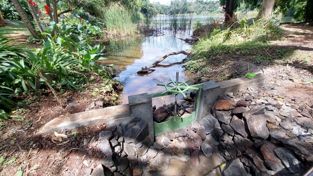 Currently there is no water flowing in the outlet as the lake levels are too low for that. Next rainy season we will be able to raise the lake level to save as much water as possible while at the same time ensuring that the level is held below the lake wall maximum outlet height. We used a laser level to build in a safety mechanism in the concrete wall holding the gate which we built 6 inches (150mm) lower than the lake wall so there's no risk of the water ever breaching the retention wall should we be unable or unavailable to lower the gate to increase outlet flow.