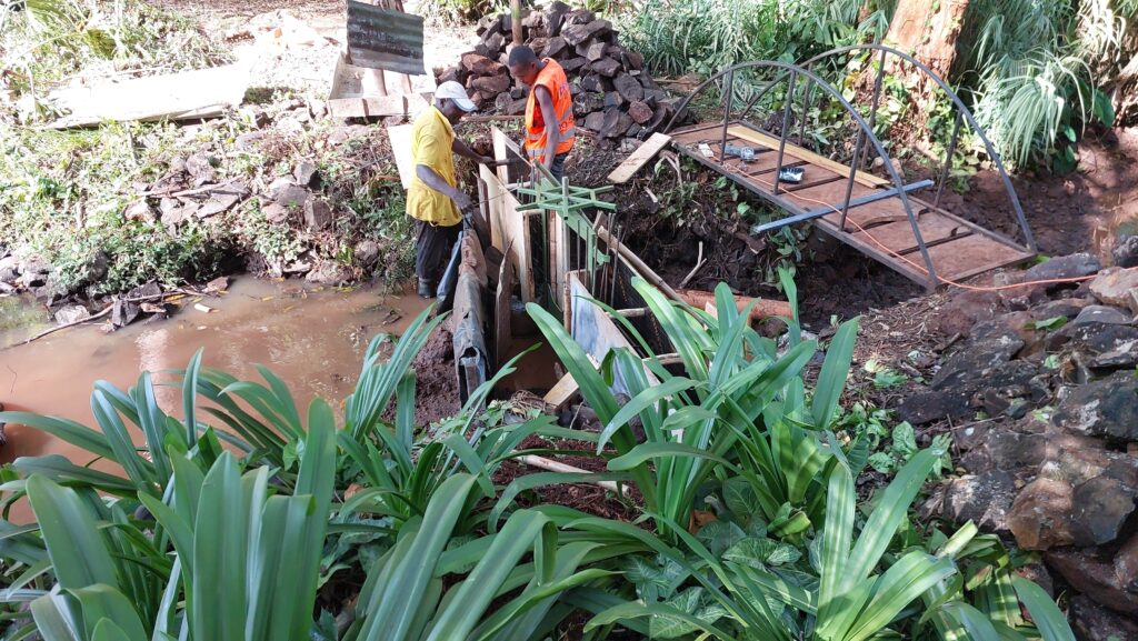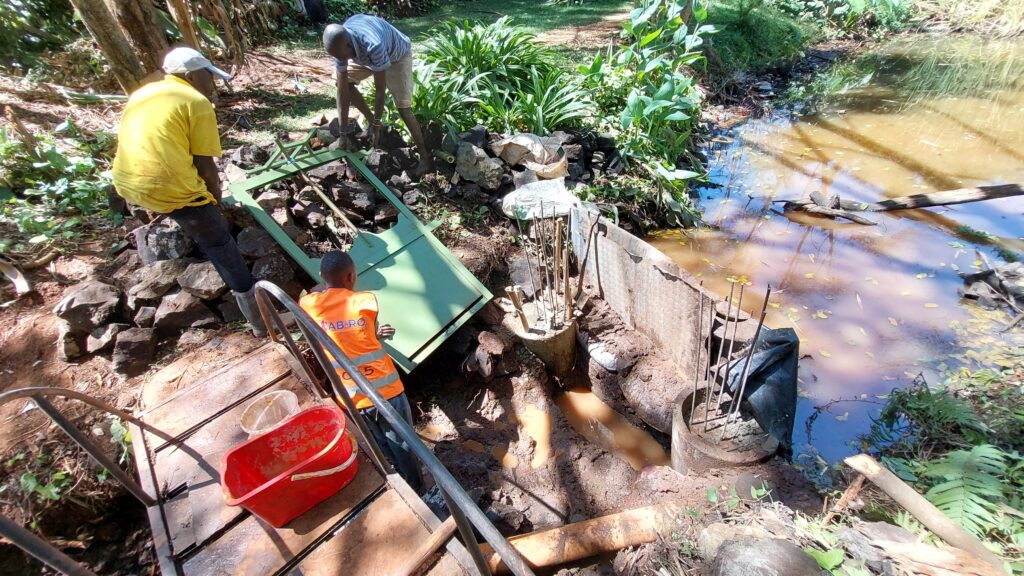 Our concrete works costs have come to just over KSh. 36,000/-. I don't know what Musa Butt spent in crafting the gate in very strong and heavy steel and including a mechanism to raise and lower it. I'd like to thank Musa and the Butt family for their efforts and apologize for taking so long to install the gate but I had to wait for the water levels to drop to the point where I could take on the concrete works. Now this is done, the concrete is one week into it's curing period (being watered 4 times daily) and should attain full strength within another 21 days. Best machine learning weather forecasts indicate no rain at all for the next 3 to 4 weeks when the gate retaining wall should have attained 4,000 to 5000 psi compressive strength.