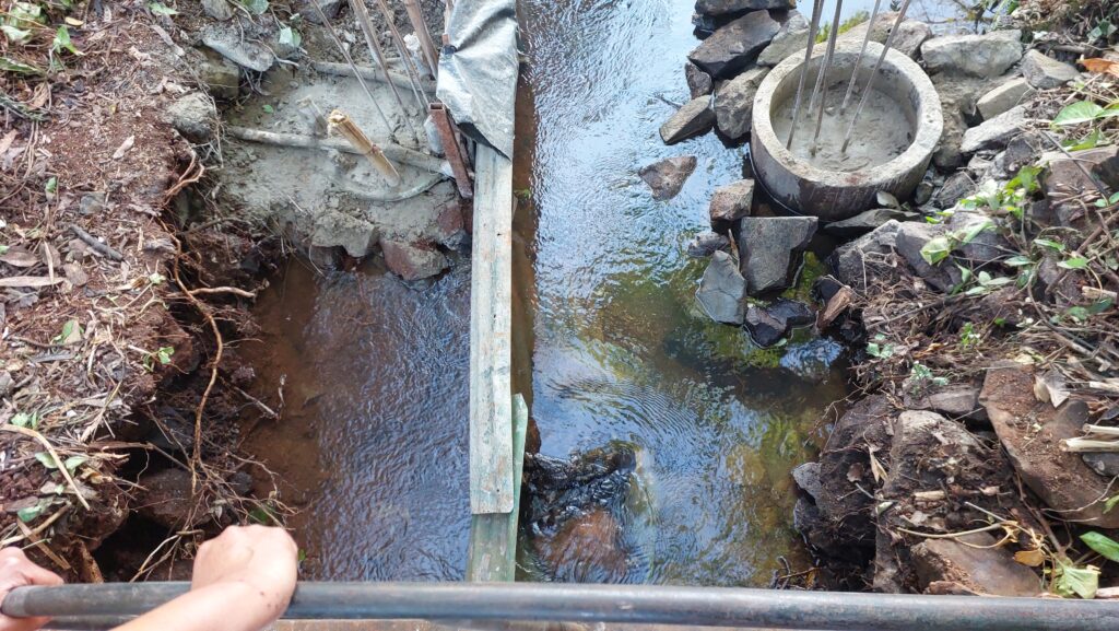 After a long wait - almost a year - the water in the lake stopped flowing during the ongoing drought (Feb 2026) and we were able to install the gate that Musa Butt built. All rebar is basaltic not steel (D12) as it will be in wet conditions nearly all the time. Steel rebar has only been used in the rebar cage rings (D8). The rebar is 12mm thick spaced max 4 inches (100mm) apart. Rings are max 12" (300mm) apart. The columns holding the gate are on concrete pedestals sitting on the bedrock of the lake. The pedestals are cylinders 18 inch (~460mm) across and 24 inch (~600mm) deep. The rebar goes right through to the bedrock and is tied into the rebar that makes the walls you see in the pictures. Musa welded tie-in pieces into the gate sides and those are well embedded in the concrete columns. The walls are embedded 3 ft (~1000mm) into the river sides. We have once more reinforced the lake walls leading to the sluice gate and past the gate into the outlet stream. All concrete was made with 1" ballast, washed sand and waterproofer additive added per manufacturer specs. The concrete was vibrated into the forms and is completely free of entrapped air voids.